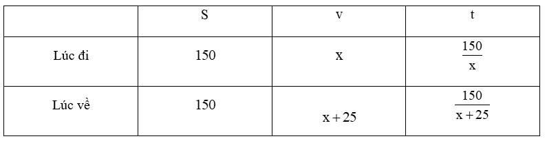 Một xe máy khởi hành từ A đến B cách nhau 150 km. Khi về, xe tăng vận tốc hơn vận tốc lúc đi là 25 km/h. Tính vận tốc lúc đi biết rằng thời gian đi và về là 5 giờ.