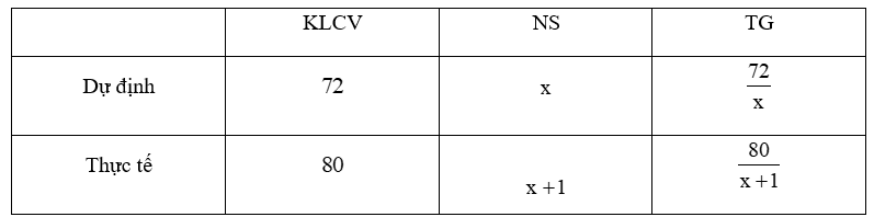 Một công nhân dự định làm 72 sản phẩm trong thời gian quy định. Nhưng thực tế xí nghiệp lại giao 80 sản phẩm. Vì vậy mặc dù người đó đã làm mỗi giờ thêm 1 sản phẩm, song thời gian hoàn thành công việc vẫn chậm hơn so với dự định 12 phút. Tính năng suất dự kiến của người đó biết mỗi giờ người công nhân đó làm không quá 20 sản phẩm.