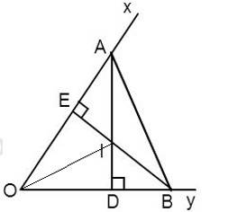 Cho góc nhọn xOy. Trên tia Ox lấy điểm A. Qua A kẻ đường thẳng vuông góc với Oy ở D. Trên tia đối của tia DO lấy điểm B, qua B kẻ đường thẳng vuông góc với Ox ở E, BE cắt AD ở I. Khi đó: