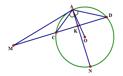 Cho đường tròn (O, R). M là một điểm nằm ngoài đường tròn, từ M vẽ tiếp tuyến MA (A là tiếp điểm) và cát tuyến MCD (C nằm giữa M và D). Phân giác góc DAC cắt CD tại K và cắt đường tròn tại N. Biết rằng tích MC.MD = 4 (cm2). Tìm độ dài MK?