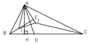 Cho \(\Delta ABC\) vuông tại A, đường cao AH, phân giác AD. Gọi I, J lần lượt là giao điểm các phân giác của \(\Delta ABH\), \(\Delta ACH\), E là giao điểm của đường thẳng BI và AJ. Chứng minh\(\Delta ABE\) là tam giác vuông.