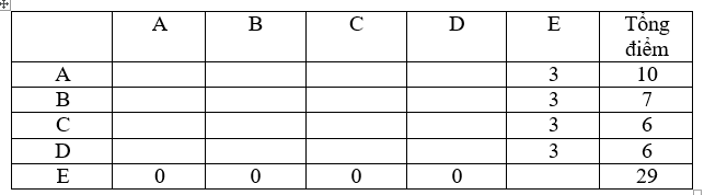 Một bảng đấu vòng loại của một giải bóng đá gồm 5 đội A, B, C, D và E. Mỗi đội lần lượt đấu một trận với các đội còn lại. Ở mỗi trận đấu: đội thắng được 3 điểm, đội thua được 0 điểm và đội hoà được 1 điểm. Sau khi kết thúc các trận đấu vòng bảng, kết quả các đội như sau: đội A được 10 điểm, đội B được 7 điểm, đội C được 6 điểm, đội D được 6 điểm và đội E được 0 điểm.