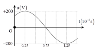 Điện áp xoay chiều chạy qua một đoạn mạch RC gồm một điện trở thuần R mắc nối tiếp với một tụ điện C biến đổi điều hòa theo thời gian được mô tả bằng đồ thị như hình bên. Cho R = 100Ω và \(C = {{{{10}^{ - 4}}} \over \pi }F\) . Cường độ dòng điện hiệu dụng trong mạch là