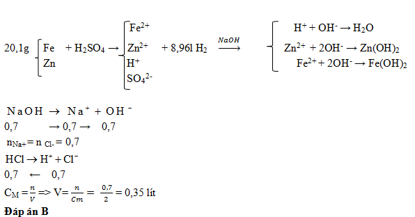 Hòa tan hoàn toàn 20,1 hỗn hợp X gồm Fe và Zn bằng dung dịch H2SO4 2M. Kết thúc thí nghiệm thu được dung dịch Y và 8,96lít khí H2 (đktc). Để kết tủa phản ứng hoàn toàn với dung dịch Y cần vừa đủ 350ml dung dịch NaOH 2M. Thể tích dung dịch HCl đã dùng là: