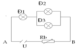 Biết hiệu điện thế hai đầu đoạn mạch không đổi là U = 30 V và các đèn có ghi: đèn Đ1 (6V - 6W); đèn Đ2 (12V - 12W); đèn Đ3 (12V - 3W). Rb là biến trở.
