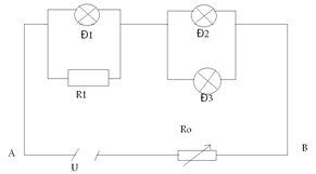 b) Mắc thêm một điện trở R1 vào mạch. Tìm giá trị của biến trở Rb cách mắc và giá trị của R1 để cả ba đèn sáng bình thường.
