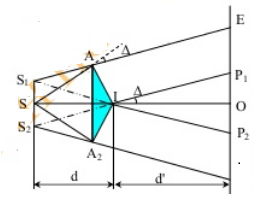 Lưỡng lăng kính A = 0,01rad, chiết suất n = 1,5; khe sáng S nằm trong mặt phẳng chung của hai