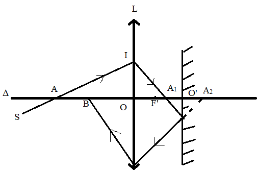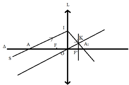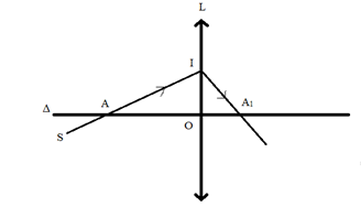 Cho thấu kính hội tụ L, quang tâm O, trục chính ∆. Tia sáng SI truyền đến thấu kính, cắt ∆ tại A1, OA = x, OA1 = 0,5x