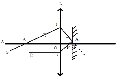 b. Đặt sau thấu kính một gương phẳng G vuông góc với ∆, cắt ∆ tại O’. Tia ló IA1 phản xạ trên gương G rồi khúc xạ qua thấu kính và cho tia ló cuối cùng JR cắt ∆ tại B. Biết OB = 2f. Tính OO’ theo x.