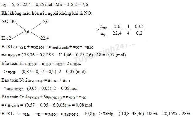 Để hoàn tan hết 38,36 gam hỗn hợp R gồm Mg, Fe3O4, Fe(NO3)2 cần 0,87 mol dung dịch H2SO4 loãng, sau