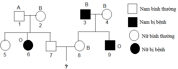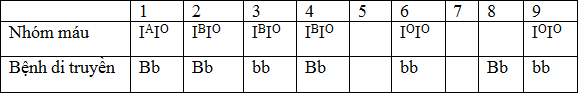 Cho sơ đồ phả hệ mô tả sự di truyền nhóm máu ABO và một bệnh ở người. Biết rằng gen quy