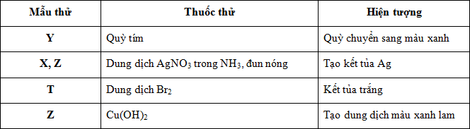 Tiến hành thí nghiệm với các dung dịch X, Y, Z và T. Kết quả được ghi ở bảng sau: X, Y, Z, T