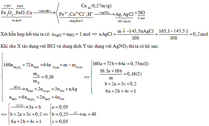 Hỗn hợp X gồm Fe2O3, FeO và Cu (trong đó nguyên tố oxi chiếm 16% theo khối lượng). Cho m gam X tác dụng với 500 ml dung dịch HCl 2M (dư), thu được dung dịch Y và còn lại 0,27m gam chất rắn không tan. Cho dung dịch AgNO3 dư vào Y, thu được khí NO (sản phẩm khử duy nhất của N+5) và 165,1 gam kết tủa. Biết các phản ứng xảy ra hoàn toàn. Giá trị của m là