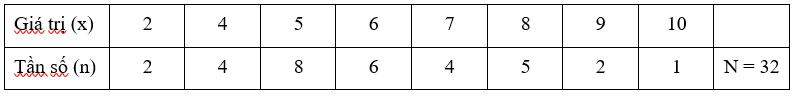 Điểm bài kiểm tra môn Toán học kì I của 32 học sinh lớp 7A được ghi trong bảng sau: