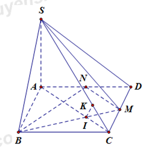 Cho hình chóp S.ABCD có đáy ABCD là hình chữ nhật cạnh, \(AB=a\sqrt{2},\,\,BC=a\). Cạnh bên SA vuông góc với đáy, SA = BC. Gọi M là trung điểm của CD. Tính khoảng cách giữa hai đường thẳng SC và BM.
