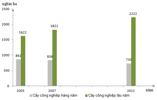 Cho biểu đồ DIỆN TÍCH CÂY CÔNG NGHIỆP HẰNG NĂM VÀ LÂU NĂM CỦA NƯỚC TA GIAI ĐOẠN 2005-2012
