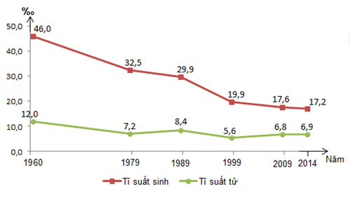 Cho biểu đồ sau Biểu đồ tỉ suất sinh,tỉ suất tử của nước ta giai đoạn 1960-2014 Căn cứ