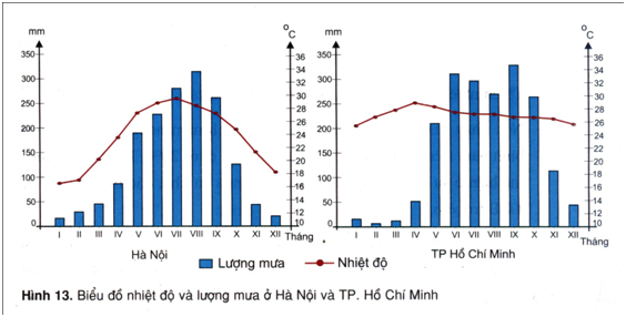 Dựa vào biểu đồ NHIỆT ĐỘ VÀ LƯỢNG MƯA CỦA HÀ NỘI VÀ THÀNH PHỐ HỒ CHÍ MINH Nhận xét