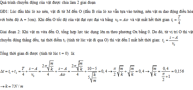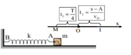 Một con lắc lò xo đặt trên mặt phẳng ngang như hình vẽ. Đầu A gắn với vật nhỏ khối lượng m = 169,5g, đầu B tựa vào tường (không gắn vào tường) và được giữ sao cho lò xo bị nén 5cm. Khi t = 0 thì thả nhẹ để hệ chuyển động tự do. Bỏ qua ma sát và khối lượng lò xo. Vật nhỏ đi được quãng đường s = 10cm đầu tiên sau thời gian 0,4s kể từ khi t = 0. Độ cứng của lò xo là: