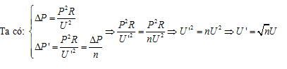 Điện năng được truyền từ một trạm phát điện đến nơi tiêu thụ bằng đường dây tải điện một pha. Cho công suất truyền đi không đổi và coi hệ số công suất của mạch điện bằng 1. Để công suất hao phí trên đường dây truyền tải giảm n lần (n > 1) thì phải điều chỉnh điện áp hiệu dụng ở trạm phát điện
