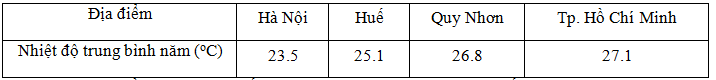 Cho bảng số liệu Nhiệt độ trung bình năm ở một số địa điểm ở nước ta (Nguồn: Niên