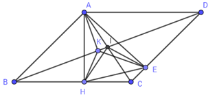 Cho hình bình hành ABCD, hai đường chéo cắt nhau tại I. Từ A kẻ các đường vuông góc với BC, CD, DB thứ tự tại H, E, K. Xét các khẳng định sau: