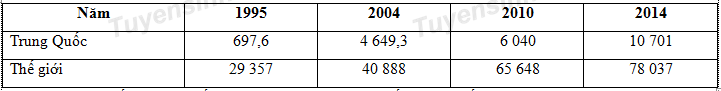Cho bảng số liệu: GDP CỦA TRUNG QUỐC VÀ THẾ GIỚI QUA CÁC NĂM (Đơn vị: Tỉ USD) Căn cứ vào
