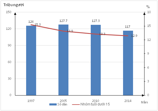 Cho biểu đồ: SỐ DÂN VÀ TỈ LỆ NHÓM TUỔI DƯỚI 15 CỦA NHẬT BẢN GIAI ĐOẠN 1997 - 2014 (Nguồn