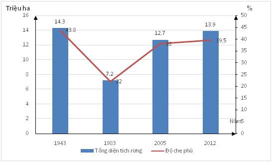=> Biểu đồ đã cho thể hiện Tổng diện tích rừng và độ che phủ rừng ở nước ta thời kì 1943-2012
