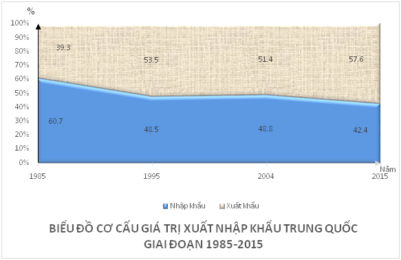 Căn cứ vào biểu đồ, cho biết nhận xét nào sau đây không đúng về cơ cấu giá trị xuất nhập khẩu của Trung Quốc trong giai đoạn 1985-2015?