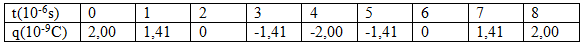 Trong mạch LC lí tưởng đang có dao động điện từ. Trong bảng là sự phụ thuộc của điện tích tức thời của một bản tụ điện theo thời gian.