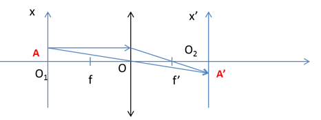 Một nguồn sáng điểm A thuộc trục chính của một thấu kính mỏng, cách quang tâm O của thấu kính 18cm, qua thấu kính cho ảnh A’. Chọn trục toạ độ O1x và O1’x’ vuông góc với trục chính của thấu kính, có cùng chiều dương, gốc O1 và O1’ thuộc trục chính. Biết O1x đi qua A và O1’x’ đi qua A’. Khi A dao động trên trục O1x với phương trình x = 4cos(5πt + π) (cm) thì A’ dao động trên trục O1’x’ với phương trình x’ = 2cos(5πt + π) (cm). Tiêu cự của thấu kính là