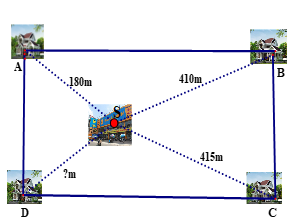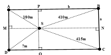 Khoảng cách từ siêu thi S đến các ngôi nhà ở vị trí tương ứng A, B, C lần lượt là 180m, 410m, 415m. Hỏi khoảng cách từ siêu thị điện máy S đến ngôi nhà ở vị trí D dài bao nhiêu mét?
