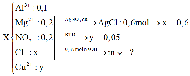 Cho dung dịch X chứa 0,1 mol Al3+, 0,2 mol Mg2+, 0,2 mol NO3-, x mol Cl-, y mol Cu2+ - Nếu cho dung dịch X tác