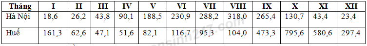 Cho bảng số liệu: LƯỢNG MƯA TRUNG BÌNH THÁNG CỦA HÀ NỘI VÀ HUẾ (Đơn vị:mm) (Nguồn: Sách