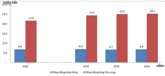 Cho biểu đồ về lúa của Đồng bằng sông Hồng và Đồng bằng sông Cửu Long qua các năm (Nguồn
