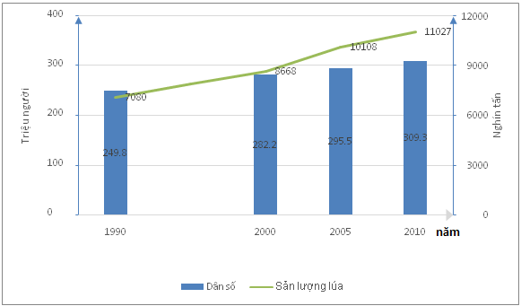 Cho biểu đồ sau: Nhận xét nào sau đây đúng với dân số và sản lượng lúa của Hoa Kỳ giai