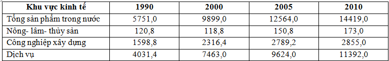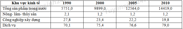 Nhận xét nào sau đây đúng khi nói về tổng sản phẩm trong nước phân theo khu Vực kinh tế của Hoa Kì giai đoạn 1990-2010?