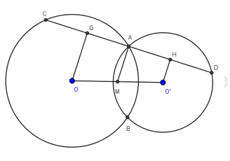 Hai đường tròn (O) và (O’) cắt nhau tại A và B. Bọi M là trung điểm của OO’. Qua A kẻ đường thẳng vuông góc với AM cắt các đường tròn (O) và (O’) lần lượt tại C và D. Chứng minh rằng AC = AD.