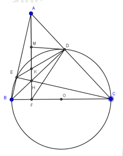 Cho tam giác nhọn ABC (AB < AC). Đường tròn tâm O đường kính BC cắt cạnh AC, AB lần lượt tại D và E. H là giao điểm của BD và CE, K là giao điểm của DE và AH, F là giao điểm của Ah và BC, M là trung điểm của AH. Chứng minh rằng: \(M{{D}^{2}}=MK.MF\)