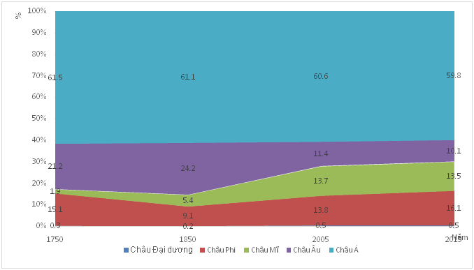 Cho biểu đồ thể hiện sự thay đổi cơ cấu dân số thế giới phân theo các châu lục giai đoạn 1750-2015