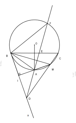 Cho đường tròn (O) bán kính R và một dây BC cố định. Gọi A là điểm chính giữa của cung nhỏ \(\overset\frown{BC}\) . Lấy điểm M bất kỳ thuộc cung nhỏ \(\overset\frown{AC}\) , kẻ tia Bx vuông góc với tia MA ở I và cắt tia CM tại D.