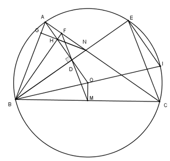 Cho tam giác ABC (AB < AC) có ba góc nhọn nội tiếp đường tròn (O) và D là hình chiếu vuông góc của điểm B trên AO sao cho D nằm giữa A và O. Gọi M là trung điểm của BC, N là giao điểm của BD và AC, F là giao điểm của MD và AC, E là giao điểm thứ hai của BD với đường tròn (O), H là giao điểm của BF và AD. Chứng minh rằng: