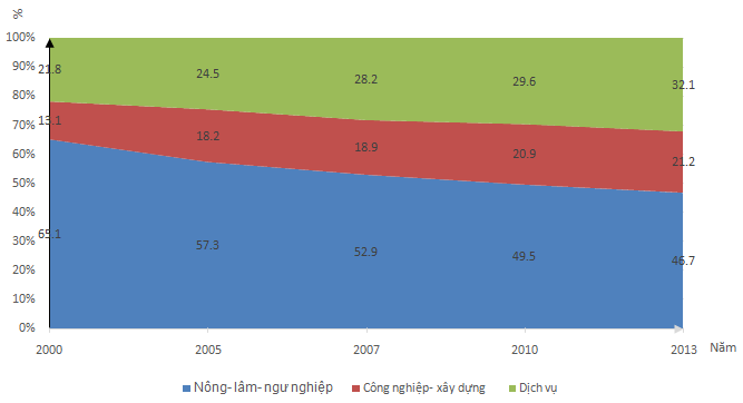 CƠ CẤU LAO ĐỘNG PHÂN THEO KHU VỰC KINH TẾ GIAI ĐOẠN 2000-2013 (%)