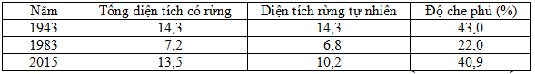 Cho bảng số liệu: DIỆN TÍCH RỪNG VÀ ĐỘ CHE PHỦ Ở NƯỚC TA QUA MỘT SỐ NĂM (Đơn vị: triệu