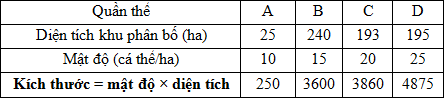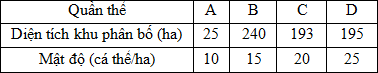 Giả sử 4 quần thể của một loài thú được kí hiệu là A, B, C, D có diện tích khu phân bố và mật độ cá thể như sau:
