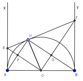 Cho nửa đường tròn (O) đường kính AB. Từ A và B kẻ tiếp tuyến Ax và By (Ax và By cùng thuộc nửa mặt phẳng chứa nửa đường tròn (O)). Qua điểm M thuộc nửa đường tròn (M không trùng với A và B) kẻ tiếp tuyến thứ 3 cắt tiếp tuyến Ax và By lần lượt tại E và F.