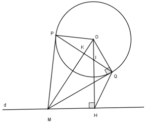 Cho đường tròn tâm O bán kính R và một đường thẳng d cố định không giao nhau. Hạ OH vuông góc với d. M là một điểm tùy ý trên d (M không trùng với H). Từ M kẻ hai tiếp tuyến MP và MQ với đường tròn (O; R) (P, Q là các tiếp điểm và tia MQ nằm giữa hai tia MH và MO). Dây cung PQ cắt OH và OM lần lượt tại I và K.