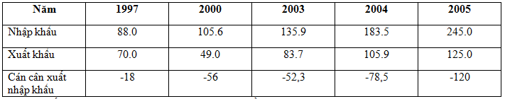 Cho bảng số liệu sau Giá trị xuất, nhập khẩu của Liên Bang Nga thời kì 1997 - 2005 (Đơn vị: