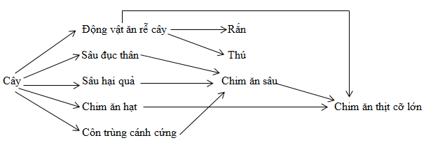 Lưới thức ăn của mọt quần xã sinh vật trên cạn được mô tả như sau: Các loài cây là thức ăn của sâu đục thân, sâu hại quả, chim ăn hạt, côn trùng cánh cứng ăn vỏ cây và một sô loài động vật ăn rễ cây. Chim sâu ăn côn trùng cánh cứng, sâu đục thân và sâu hại quả. Chim sâu và chim ăn hạt đều là thức ăn của chim ăn thịt cỡ lớn. Động vật ăn rễ cây là thức ăn của rắn, thú ăn thịt và chim ăn thịt cỡ lớn. Phân tích lưới thức ăn trên cho thấy: